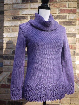 Lola is a simple sweater with eye-catching bobble and lace scallop details at the bottom hems and sleeve cuffs. Sweater is worked flat from bottom up with set-in sleeve construction, providing a tailored and classic silhouette. Cowl is knit in the round.