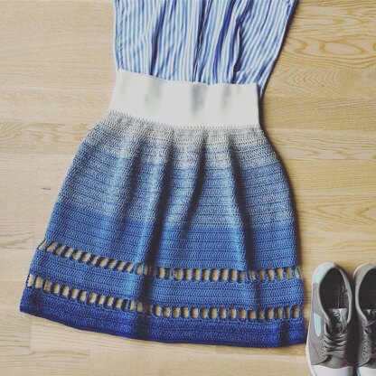 You will need: - Crochet Hook - 3.5 mm; US - E/4; Uk – 9 - Crochet Hook - 2 mm; US – 1/B; Uk – 13 - Awl or sewing needle - Sample made from Madame Tricote Maxi 100 gr/ 3.5 oz; 565 m/ 617 yds Colours – light grey (6307), blue (4913), dark blue (4915); TO MAKE GRADIENT YOU NEED TO WORK 3 STRANDS TOGETHER - S: light grey (6307) – 1 ball, blue (4913) – 3 balls, dark blue (4915) – 1 ball - M: light grey (6307) – 1.5 balls, blue (4913) – 3.5 balls, dark blue – 1 ball (4915) - L: light grey (6307) – 1.5 balls, blue (4913) – 4 balls, dark blue – 1.5 ball (4915) - Elastic Ribbon: wide 10cm/4 inch, length 1 m / 40 inch - Other Recommended yarn – Rico Essential Crochet, or any other mercerized cotton, just be sure that in 100gr/3.5oz aprox. 565 m / 617 yds, FOR MAKING GRADIENT WORK 3 STRANDS TOGETHER