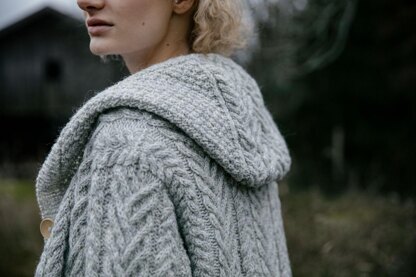 The Long Road Hoodie is a hooded cable cardigan that will keep you warm on a cold winter day. The garment is worked from the top down. See also the Long Road Cardigan, Pullover and Hat.