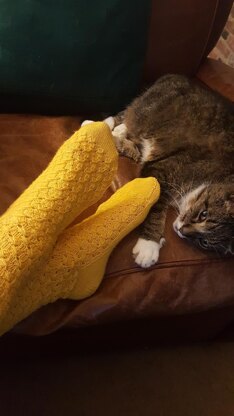 A Hundred Ravens Patos is a light fingering weight yarn with the added strength of nylon for long-lasting wear. The bright yellow sample socks are in colorway Apollo.
