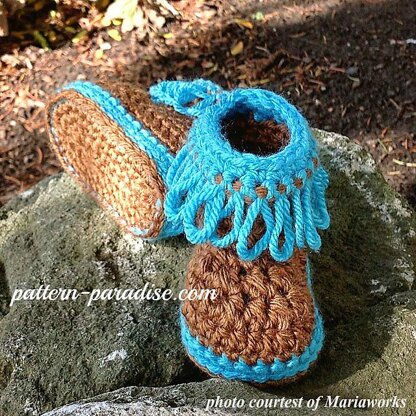 These little shoes can be made as moccasins, ankle length boots or calf length! Make them with loops or trim the loops for a fringe. Why not try adding a bead to the loops for a more "girly" look? They are unisex and can be made with as many rows of the loop border as you desire. Very adaptable to customization.