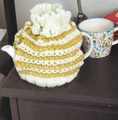 This is a pattern for a loop stitch tea cosy, originally published in Knitting magazine. It is worked in a simple two colour slip stitch with 2 x 2 rib edges and eyelets to fasten. It would be fine for beginners. Photos Knitting magazine.