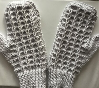 These mittens are easy to do if you can follow a pattern once it is set. The ribbed cuff you could knit longer then you can turn them up or leave down. There are 3 sizes to choose from Sizes Width around the palm Length from top of rib to top of mitten. Small 7 ins 18cm 8ins 20.5cm medium 8 ins 20.5cm 8.5 ins 21.5cm large 8.5 ins 22cm 9 ins 23cm