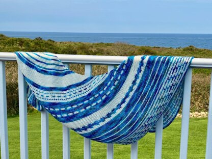 Lorelei’s Looking Glass is a playful two-color vortex-shaped shawl whose patterning mimics the reflection of sunlight rippling across the water. Its garter stripes and slip-stitch motifs make for an engaging, but not overly complex, knit.