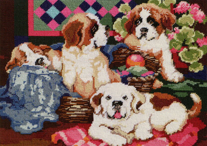 Designed by: Linda Gillum. Lotsa Puppies anxious to join your menagerie! Totally irresistible; hold onto your heart as you stitch these colorful St. Bernard characters! This design by Linda Gillum for Kooler Design Studio is rich in color and imagery and the perfect design for dog lovers\n\n