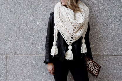 The ultra chunky Louisa Wrap puts a modern spin on a timeless classic. Gone are the days of “granny shawls” and frumpy knitwear. With sporadic eyelet rows and oversized tassels, this wrap radiates contemporary sophistication whether it’s worn the traditional over-the-shoulders way or flipped around like a scarf with the point in front.