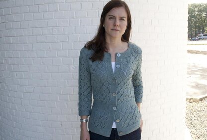Introducing Louise – a shapely lace cardigan with three-quarter sleeves, perfect for spring. Unbuttoned it’s a casual hip-skimming topper, or button it up to reveal hour-glass shaping with blousy elegance. Worked overall in easily-mastered Lozenge Lace, its waist and all edges are trimmed with wide Garter bands. Short rows placed throughout the button band compensate for row gauge differences. Pieces are knit flat, bottom-up, with seaming. Enjoy!