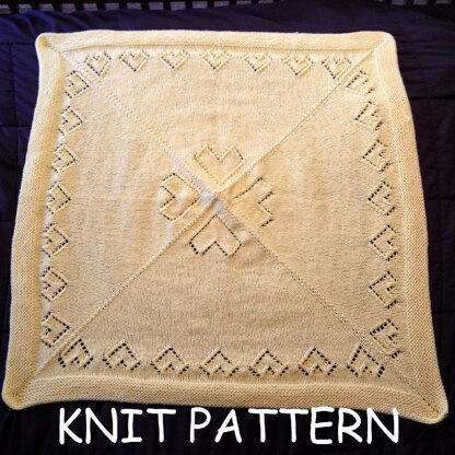 This baby blanket is knit from the center out using an original heart pattern around the center and along the border. The knitting starts on double pointed needles and changes to a circular needle when the piece is large enough.