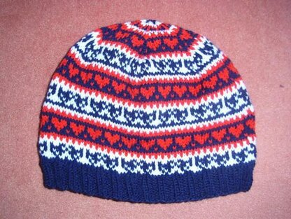 Cute little birds and hearts are all around this beanie. The ribbing is single-colored. It's also part of the beanie set "Big sister, little sister" I made for my big little sister and me.