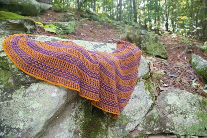 It looks complicated, but it really isn't. This shawl is worked from side to side, starting at the small point and growing towards a long, swooping bind-off. Believe it or not the stitch pattern is 4 stitches wide and 4 rows long. By working the pattern in stripes and shifting which color is on which two rows you create two very different looks - producing the wide stripes that you see.