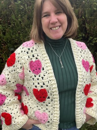 Make this gorgeous crochet heart jacket, perfect for valentines day or anytime of the year!! The jacket is constructed from heart granny squares. It’s made with chunky yarn so has a nice weight to it.
