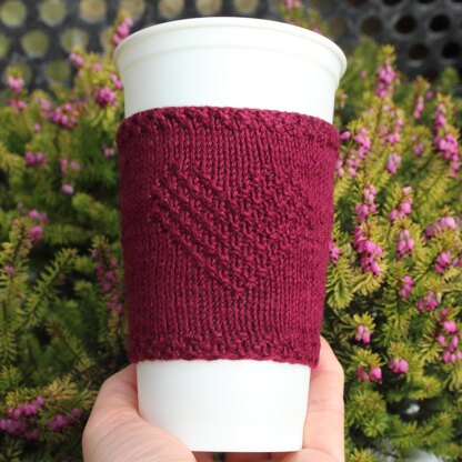 The pattern includes written instructions (stitch by stitch and row by row) and charts for knitting in the round cup cozy with three hearts.
