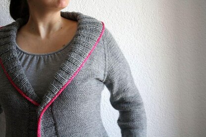 Le col châle est travaillé en aller-retour, avec quelques rangs raccourcis.