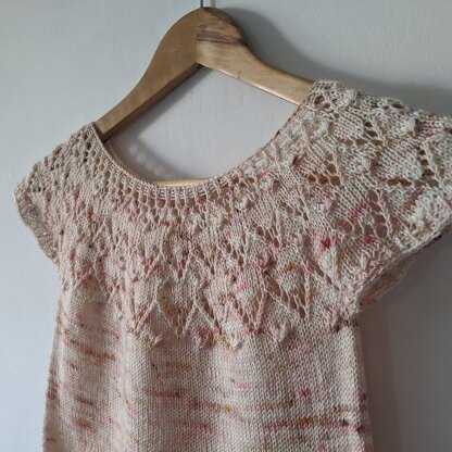 We work from the bottom up using a simple yoked construction, all edgings are finished in neat twisted ribbing, and it’s a completely seamless knit. We give instructions for 9 sizes to fit bust 70-155 cm/28–62”. Both written instructions and charts are given for lace patterns. Measurements are given in both imperial and metric units.