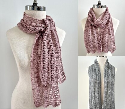 The Lovely Lace scarf crochet pattern is designed by Valerie Baber just for you to add an elegance to your day with style. Designed using sock/fingering weight yarn. A beautiful lace scarf with an accent trim on each end to finish the design. Shown in a beautiful linen and silk yarn perfect for any time of year in the pink and a lovely alpaca and silk yarn in the grey great for the cooler days. This scarf is perfect for any time of the year by changing the fibers used. Try using merino wool, kid mohair, alpaca and other warmer fibers for the fall and winter to lighter fibers like cotton, silk, linen etc. for spring and summer. A very versatile scarf design that you will wear for years to come.