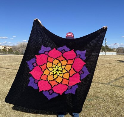 This lovely lotus uses a simple stitch and scrap yarns to create a blanket with a harmonious vibration. Use it as a blanket, a wall hanging, or a backdrop for photography.