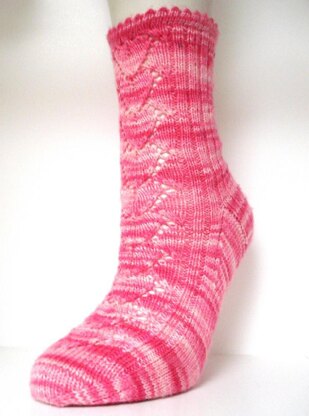 This is the February 2009 sock for the Politically Incorrect sock club. Columns of heart-lace line up with simple ribbing and a girly picot edge to make a very, very pink sock. Perfect for Valentine’s, October, or anytime you want extra girly feet!