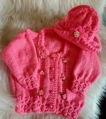 Stunning Set comprising of Cardigan and Hat. “Lucia” was designed to celebrate the birth of the most beautiful little granddaughter of friends in Cork. I wanted to create something really girlie that most knitters could tackle and this is it. The cuffs and bottom are a smock stitch and the remainder is stocking stitch with a picot edge. The hat, how beautiful is this, mirrors the smock stitch with a gorgeous brim with picot edging.