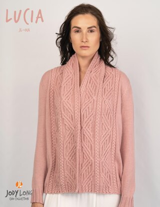 Lucia is a heavily cabled open front cardigan.