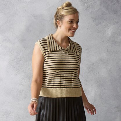 Lucille is a sleeveless striped top with a collar and pockets.