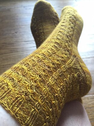 A toe-up cabled sock with inverted gusset heel. Originally released with Three Irish Girls as part of their ‘Sock It To Me’ Sock Club in March 2015.