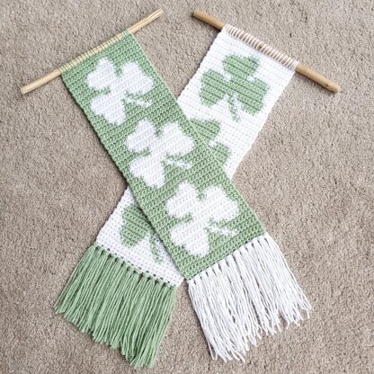 Design your own luck this St. Patrick’s Day with my handmade tapestry crochet wall hanging. The three green clovers on a white background symbolize hope, faith, and love, and the green fringe adds a touch of whimsy.