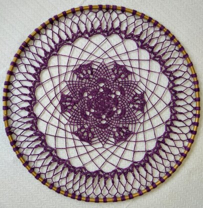 Lucy includes several different fun lace motifs to keep things interesting, beginning with a fun circular design, branching into a pineapple star motif, and then expanding quickly with a lace mesh. Jasmine chain puffs bring things back together before attachment to the hoop. You'll need fingering weight yarn (up to 400y) and a 28" floral hoop!