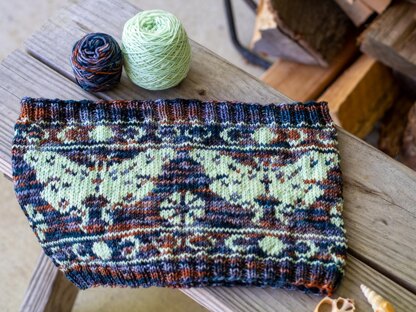 Luna moths signify new beginnings as they represent a continuing quest for truth and knowledge, the gift of intuition, psychic perception and heightened awareness. This charted cowl is worked in the round using a Luna Moth and Moonflower chart to evoke new beginnings and see the light during the darkness