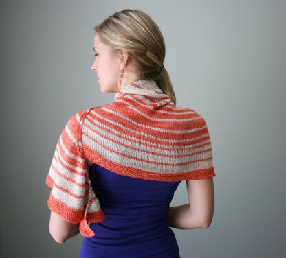 Lunaris (Latin for lunar, after its moon-like shape) is a simple crescent-shaped shawl with just a bit of ruffle. Worked from the top down in Stockinette stitch with a gradient stripe pattern, it can be done monochromatically – in two yarns with similar weights but different textures – or with more distinct stripes. Wrapping it around the neck creates a scarf with cascading ruffles; draping it as a wrap really shows off the stripe pattern – either way this is a lovely light piece to wear as the seasons change.