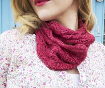 The Lunch With a Friend cowl is a design that came out of one of our discussions. We looked at the wrong side of some wide welted ribbing, and loved the thin stockinette stitch line that was created. Taking this as inspiration, this cowl uses that stitch as a base and adds a lace stitch to each side. It is knit in one piece with a provisional cast-on, then the ends are grafted together for a seamless cowl.