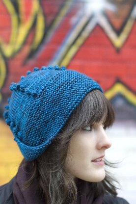 Baah and bobbles and brim-flaps, oh my! This quirky, slightly-elven cap can be worn with the brim detail to the front, back, or side and is knit with gorgeous hand-dyed sock yarn, held double for speed (which makes it nice and dense and warm, as well!)