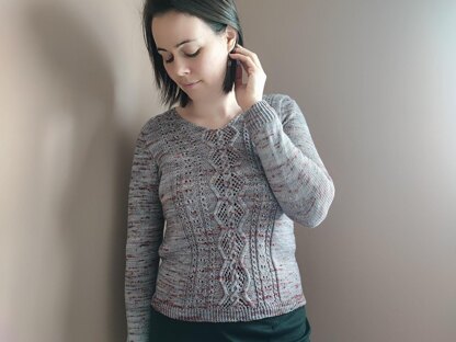 Lychnis is a V-neck sweater with set-in sleeves knitted from the top down. It has a pretty panel of cables and lace on the front which brings all its charm to the model.