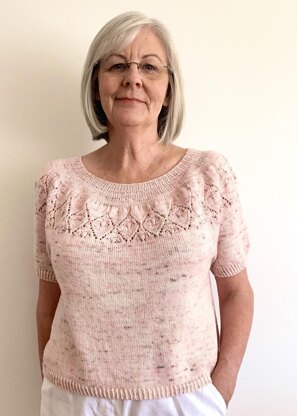 Constructed top down, and in the round, Lycoris has short sleeves and a rounded neckline elevated in the back with short rows for better fit. A lovely floral lace enhances the yoke.