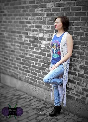 The Lyrical Maxi Vest is a gorgeous open front vest that features a lacy bottom and long fringe.