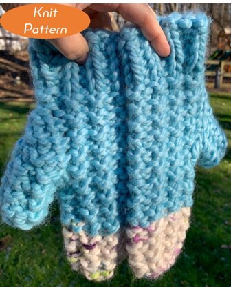 Macari is an mitten pattern worked from the bottom up using a two-row repeat of knit and purl stitches. The thumb stitches are moved to stitch holders or scrap yarn while the rest of the mitten is finished, then the thumb is picked up and finished. It uses two colors of #6 super bulky yarn. Sample shown is a size Woman-Large and uses Premier Yarns So Woolly in Raindrop and Water Lily.