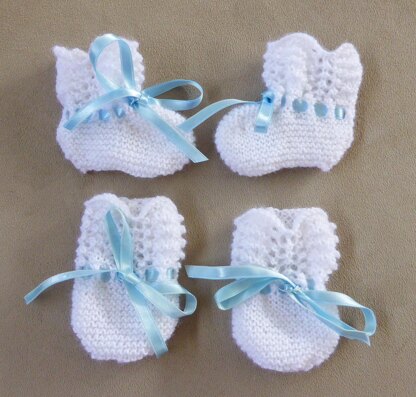 This 4ply Bootie and Mitten set is worked in a feather and fan lace pattern then garter stitch. So easy and quick to knit yet a practical present for a new bub that every parent will treasure.