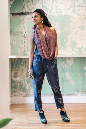 Mackenzie River is a pretty cowl with a diagonal lace pattern, worked in the round from the bottom up. The Traveling Lace pattern is provided in both written and charted form.