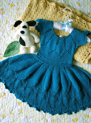 This top-down dress features a repeating petal pattern forming the yoke and skirt. Elaborate diamond lace decreases in the full skirt create the illusion of extra layers. Moss and garter stitch add texture, while the lace stitches keep it cool for warm weather.