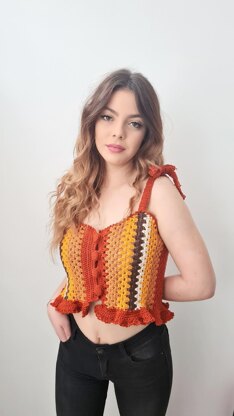 Supplies: Crochet yarn and hook: I used 100% cotton sport yarn in 5 colors (terracotta {150gr}, mustard {40 gr}, sunny yellow {20 gr}, brown and off-white {15 gr each}) metal 3 mm hook (UK11) (US 10/3). The granny stripe pattern is used to make this top. Used terms in American terminology: chain (ch), slip stitch (sl st.), single crochet (sc), half double crochet (hdc), double crochet (dc), dc2tog, 3-ch picot Other: 4 buttons, sewing needle and thread, tapestry needle. The tutorial shows how to make crochet covered buttons (buttons size 2mm). Length of finished top buttoned up: 39 cm (15.3") across and 26 cm (10.2") down. Fit size: S/M. The top can be made in one color only, for which you will need about 240-250 grams of yarn depending on whether you crochet more loosely or tensely. Leftover yarn is great for this project