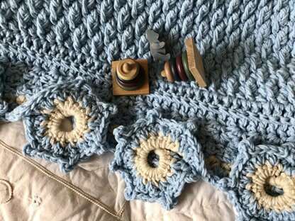 Magical pinwheels dance across the edge of this special baby blanket! So warm and stylish! Fits any decor in any room. Simple crochet stitches throughout.