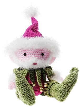 Make your list and check it twice with the help of this whimsical little fellow. He’s wearing a very fetching pink and green outfit, but could easily be made in other colors to suit your holiday decorating tastes. Bright red and green, cranberry and pine, shades of white and cream, silver and gold— all these color schemes, along with gold or silver jingle bells as you wish, are beautiful for this adorable little guy. His jointed legs allow him to sit or stand. Skill level: intermediate. Pattern is in American terminology.
