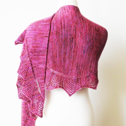 Magine is a triangle shaped shawl featuring a lacey eyelet edging with the main body in garter stitch. The lace edging can be blocked into large diamond points as shown or as scallops. The simple, elegant structure of this shawl is perfect for showing off a lovely hand dyed yarn. Choose between the large or small version. This pattern is easy to memorize after a few pattern repeats. Knit from side to side, you have the ability to use all of your yarn without needing more – just weigh your yarn first. Simply work the increase section till your yarn is half gone, then start decreasing for the second half.
