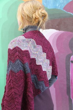 Magmatic BOOM takes a stitch I developed for the Magmatic MKAL and applies it to a boomerang shaped shawl. The chevron stitch with elongated stitches and placed beads that zig-zag within the pattern is too much fun!