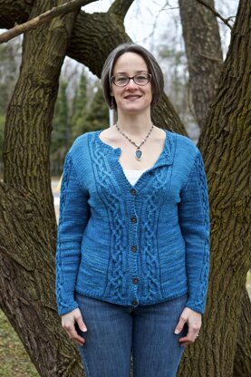 Maiar is a hip-length cardigan with intricately cabled sleeves and mirrored cable fronts. Maiar is from the root ‘excellence’ in JRR Tolkein’s elvish tongue, Quenya.