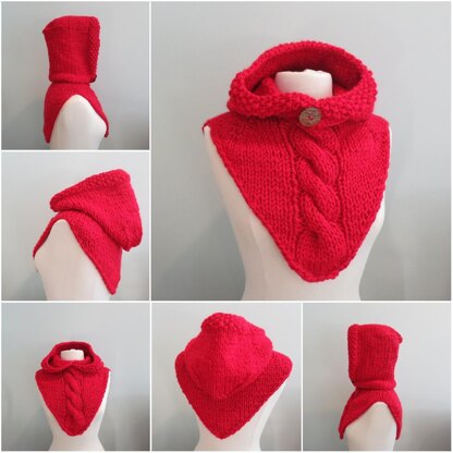 The Maid Marian 3 Hooded Cowl is a very quick knit in #6 super bulky yarn. The generous hood has a button front so you can make it extra snug around your face and you can wear another hat within the hood. The long bandanna-style cowl in the front and back provides added warmth where you need it the most. The Maid Marian 3 can be used for layering and can be worn over or under your outerwear.