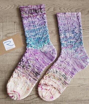 Maid of the River is a toe up sock pattern with a short row heel. It has a winding cable up the centre of the sock, with a simple lacy pattern either side of the cable, representing the plants on the river bank. The pattern is fully charted, with written instructions for the toe, heel and cuff.