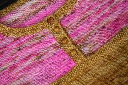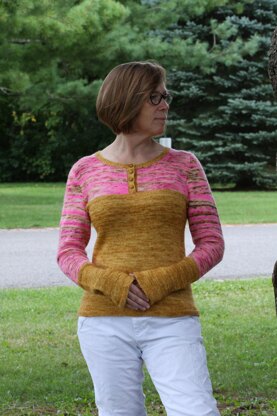 Inspired by garments of Vikings, and characters in books and film who have body armour and cuffs to protect them as they live through grand adventures. This sweater has two colours to define bodice, and distinct cuffs, with a flattering neckline to compliment the contrasting yoke and sleeves. The textured hems and bands hint of hammered metal, yet they are soft and wearable. This sweater is striking in solids, hand-dyed variegated yarns, or a combination of both.