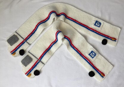 Uses worsted weight yarns, and knitting needles US # 8, and # 6 for some of the details. It works up rather quickly too. Complete the set with our new Mail Van or Fire Truck hat for a sweet gift for kids! If you liked our truck scarf pattern, you will love this one too. Remember to make one for your mail carrier as a gift too.