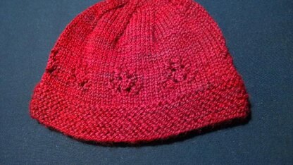 I designed this beanie to coordinate with the sweater using one of the lace patterns and the garter stitch edging.