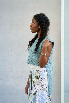 Named Mairead, Irish for pearl, is this high-low vest adorned with Celtic cables crowned with an I-cord neckband. The sides are made with a triple selvedge, to make the longer back part lie flat. The vest is seamed with the neckband worked in the round. Mairead is knitted in the airy Norwegian combed wool yarn Ask from Hillesvåg Ullvarefabrikk.